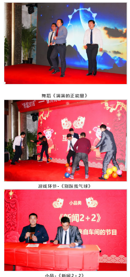 接下来精彩的晚会在欢快的音乐中拉开了序幕,事业部的《小人舞》,令人开怀大笑;事业部和销售部带来的舞蹈《满满的正能量》,正能量满满;销售西安办的歌曲《突然的自我》,歌词动人,歌声悦耳;生产部的小品《新闻2+2》,妙趣横生,诙谐幽默;开心的游戏环节,大家忘掉工作的烦恼,尽情玩耍。激动的抽奖时刻,大家翘首以待抽奖结果,下面我们就来回顾本次晚会精彩的瞬间: