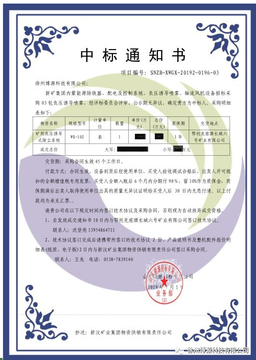 热烈祝贺工业除尘设备厂家博源科技在传捷报!今日,新矿集团,内蒙能源除铁器、配电及控制系统,负压诱导喷雾,轴流风机设备招标采购负压诱导喷雾,成功选中博源科技!这是对我们付出的肯定!